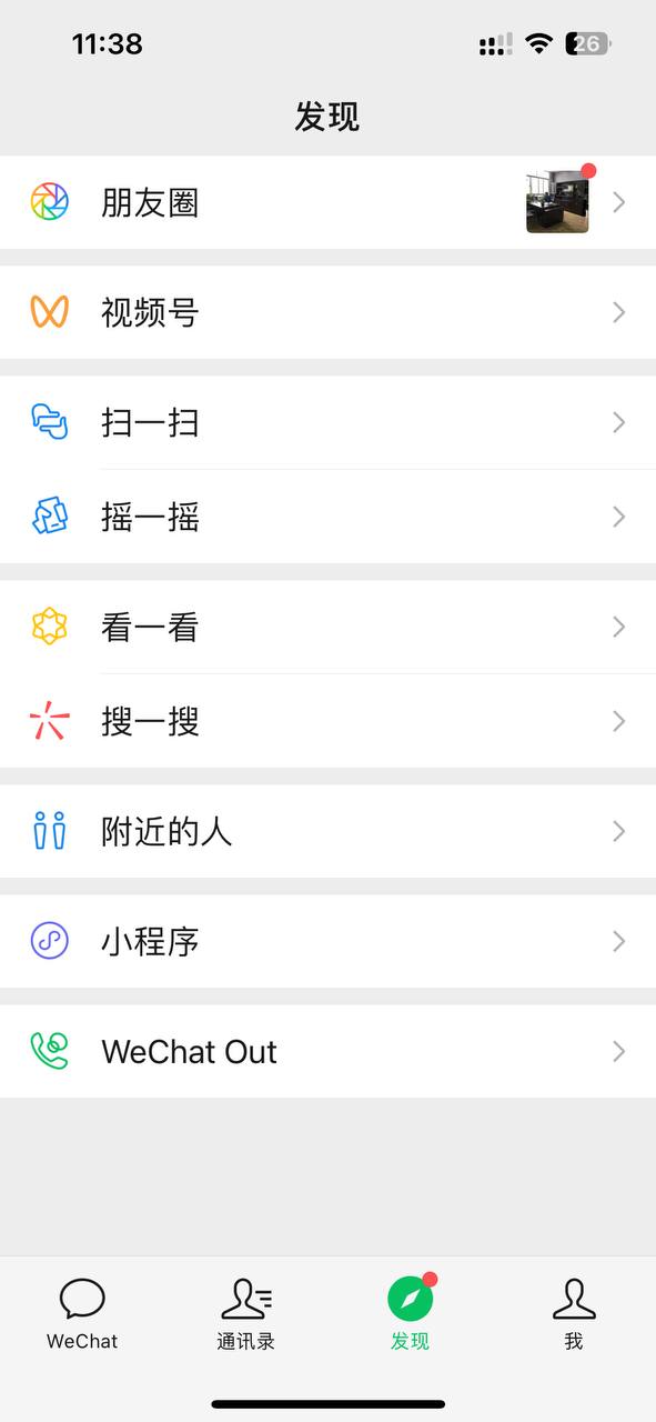 三、用你的美国手机号码换绑微信的手机号码,有时候会提示由于安全原因无法换绑,请务必使用常用手机,常住城市进行操作,有挂代理的务必关掉代理。换绑成功后退出微信,重新登陆微信,这时候你就能发现你的微信号在发现下发多了一个 wechat Out的按钮。