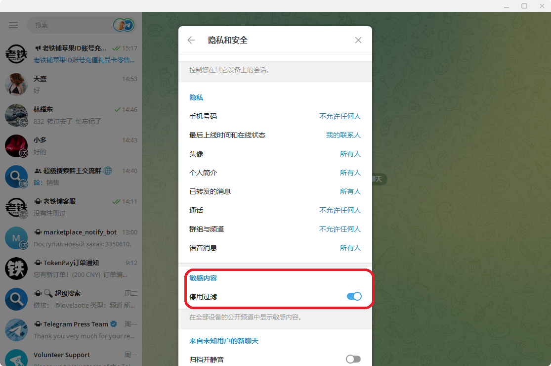 方式一:打开 Desktop 电脑桌面客户端, 左上角三短线: 设置→隐私安全→开启”敏感内容”→停用过滤