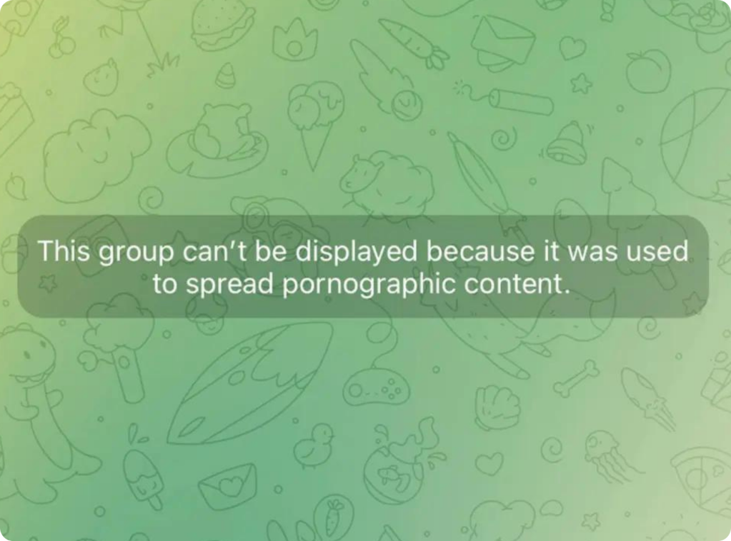telegram如何进入敏感群限制群开车群的设置教程This group can't be displayed because it was usedto spread pornographic content.