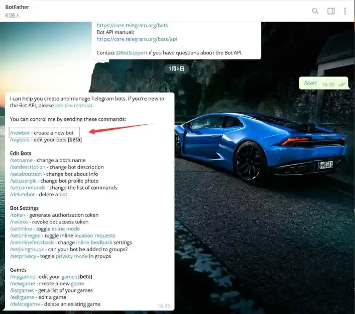 3、我们点击选择或者手动输入/newbot,创建一个自己的机器人。