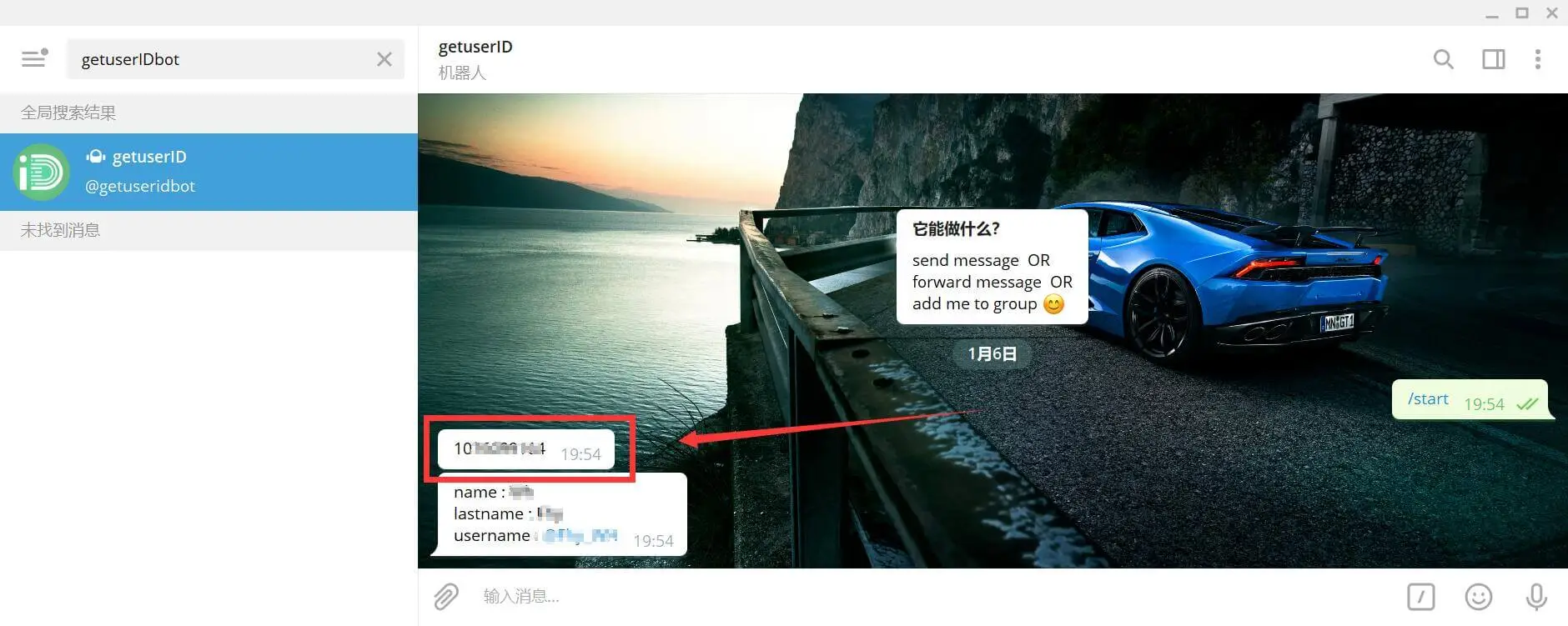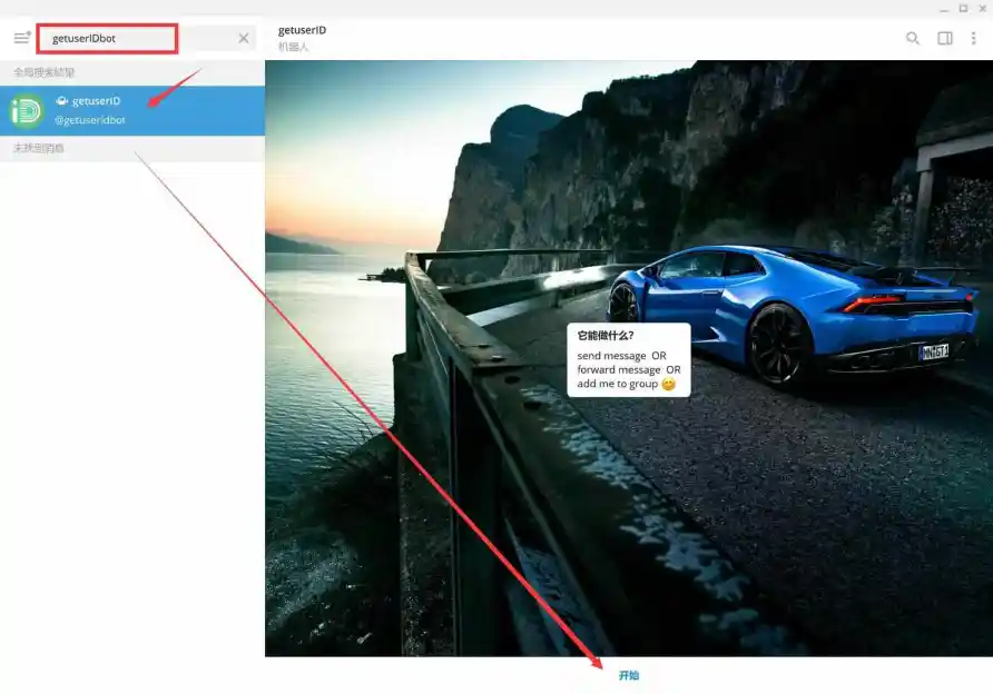 6、继续搜索,输入getuserIDbot,并点击开始按钮进入对话,此时getuserIDbot会发送给你一串数字,就是后面会用到的UserID