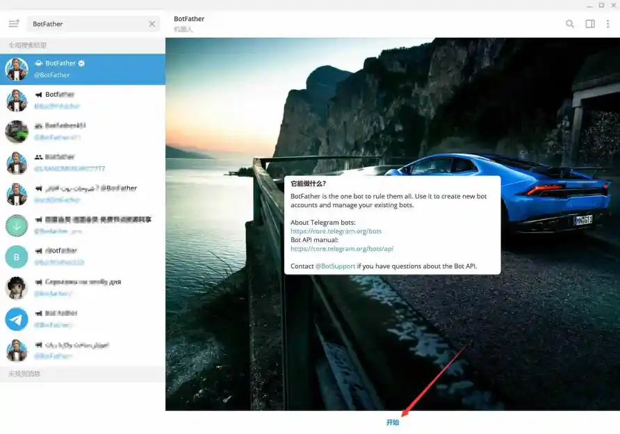 2、点击BotFather后,在对话框下方点击开始与BotFather对话,此时BotFather会列出来所有代码命令。