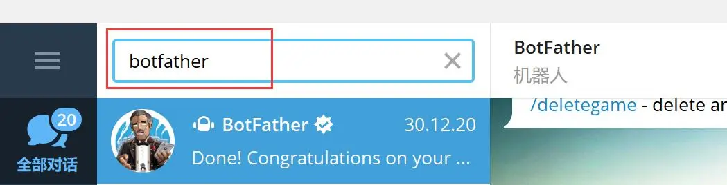 1、首先在Telegram上搜索BotFather机器人。需要注意的是,搜索结果中选择ID为@BotFather的,见下图
