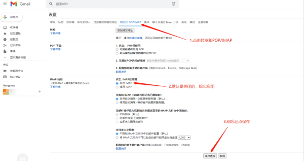 然后找到上方的:转发和 POP/IMAP 点进去,任何邮箱初始IMAP都是关闭的,这里点启用 IMAP最后保存更改就可以了。
