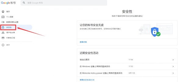 在开通了IMAP服务,还需要向谷歌获取应用密码才可以使用,此时我们访问谷歌账号页面:https://myaccount.google.com/ 在左侧的菜单下,选择安全性